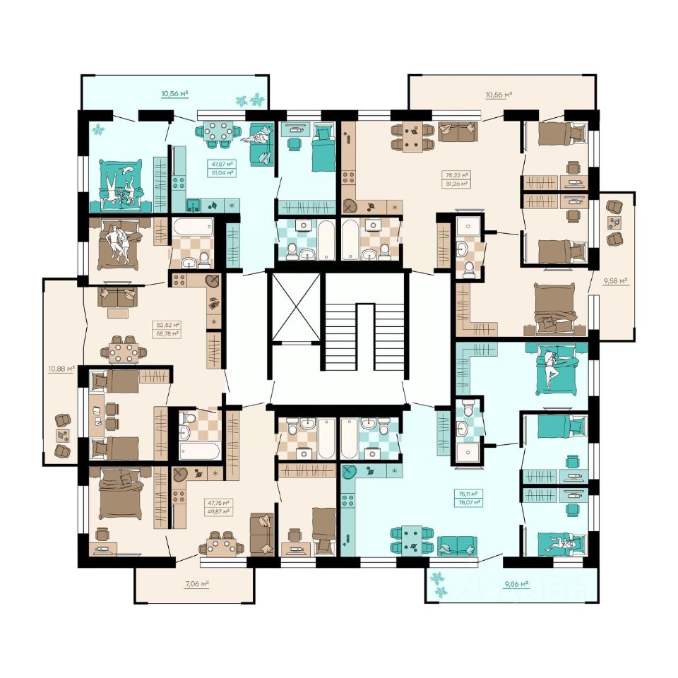 Квартиры формата Smart Comfort + (смарт комфорт +) площадью от 32 кв. м до 136 кв. м предоставляют свободу в реализации планировочных решений, а высота потолков 2,7 м с увеличенными панорамными окнами 2,45 м обеспечивают высокий уровень естественного освещения и открывают завораживающий обзор на лесной массив загородной местности.