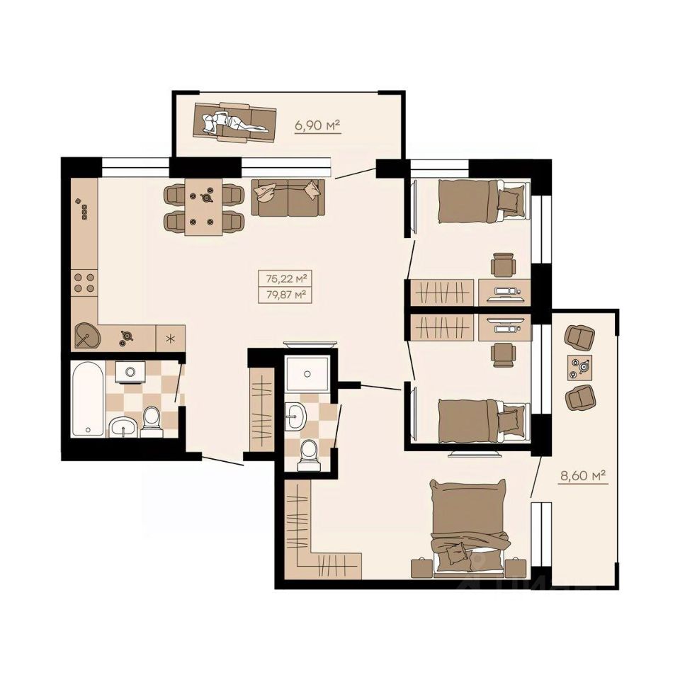 Отличительной особенностью проекта являются просторные индивидуальные террасы на первых этажах площадью до 65 кв. м, открывающие безграничные возможности для обустройства собственного сада, пространства для барбекю, персонального пляжа с шезлонгами или рабочей зоны на открытом воздухе.