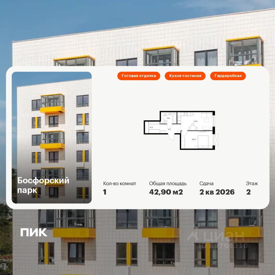 Продаётся 1-комн. квартира площадью 42,9 кв.м на 2 этаже 9 этажного дома (Корпус 6, Секция 1) проекта ПИК Босфорский парк. Светлый просторный подъезд на уровне земли, функциональная планировка, большие окна, c отделкой.