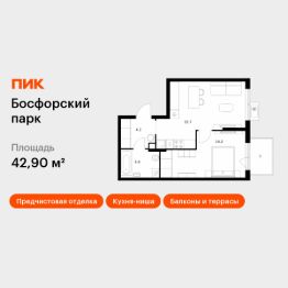 Продаётся 1-комн. квартира площадью 42,9 кв.м на 8 этаже 9 этажного дома (Корпус 10, Секция 1) проекта ПИК Босфорский парк. Светлый просторный подъезд на уровне земли, функциональная планировка, большие окна, предчистовая отделка.