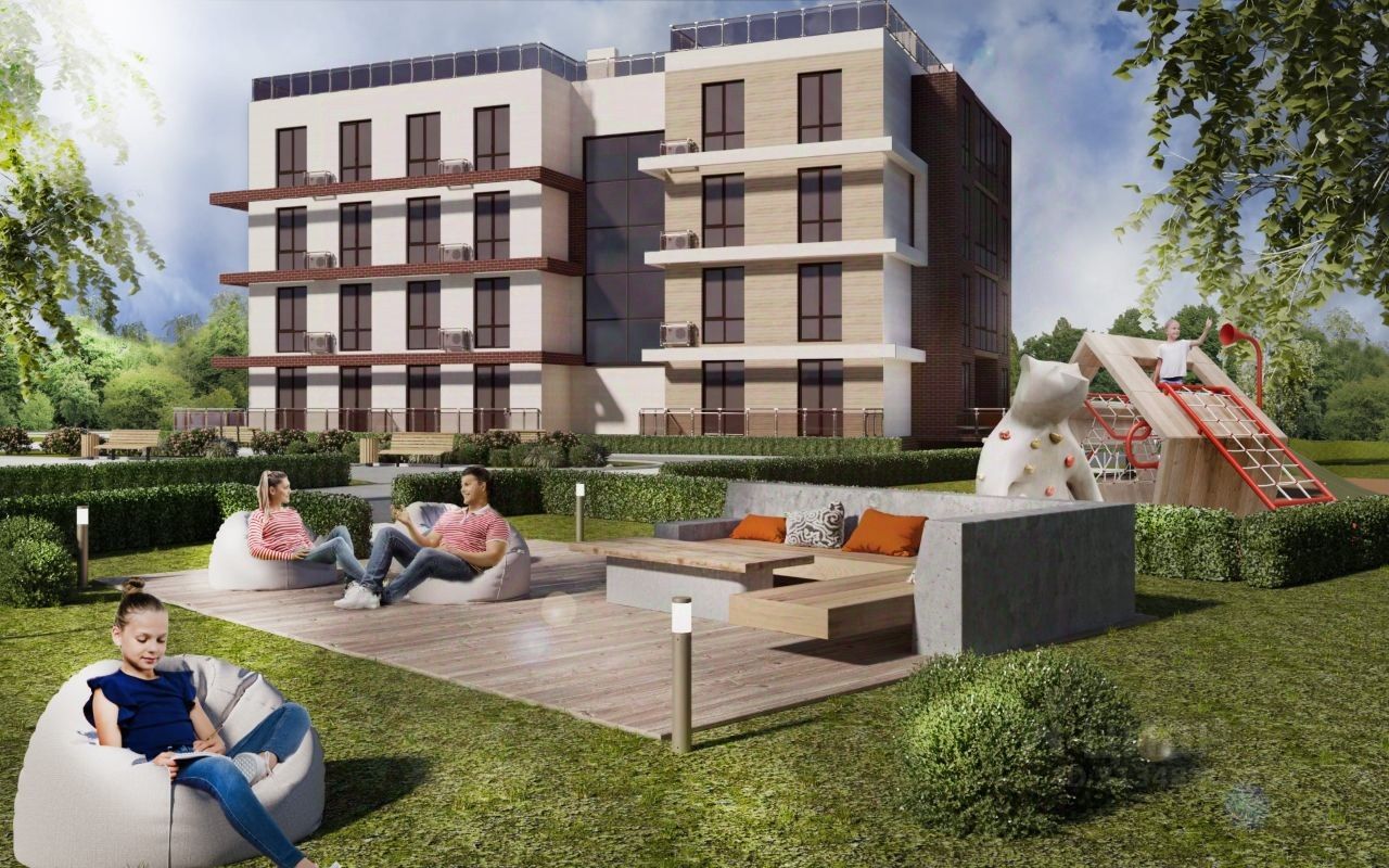 На территории комплекса прогулочная зона со скамейками, беседкой, зоной барбекю, современная спортивная и безопасная детская игровая площадки.
