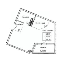 Продаётся 1-комнатная квартира в строящемся доме (Корпус 1), срок сдачи: II-кв. 2026, общей площадью 44 кв.м., на 19 этаже.
