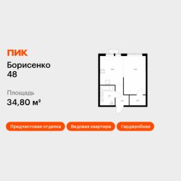 Продаётся 1-комн. квартира площадью 34,8 кв.м на 26 этаже 28 этажного дома (Корпус 2, Секция 2) проекта ПИК Борисенко 48. Светлый просторный подъезд на уровне земли, функциональная планировка, большие окна, предчистовая отделка.