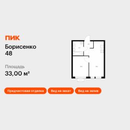 Продаётся 1-комн. квартира площадью 33 кв.м на 23 этаже 28 этажного дома (Корпус 2, Секция 2) проекта ПИК Борисенко 48. Светлый просторный подъезд на уровне земли, функциональная планировка, большие окна, предчистовая отделка.