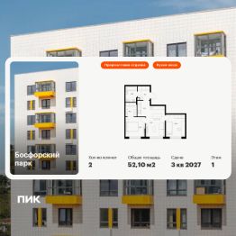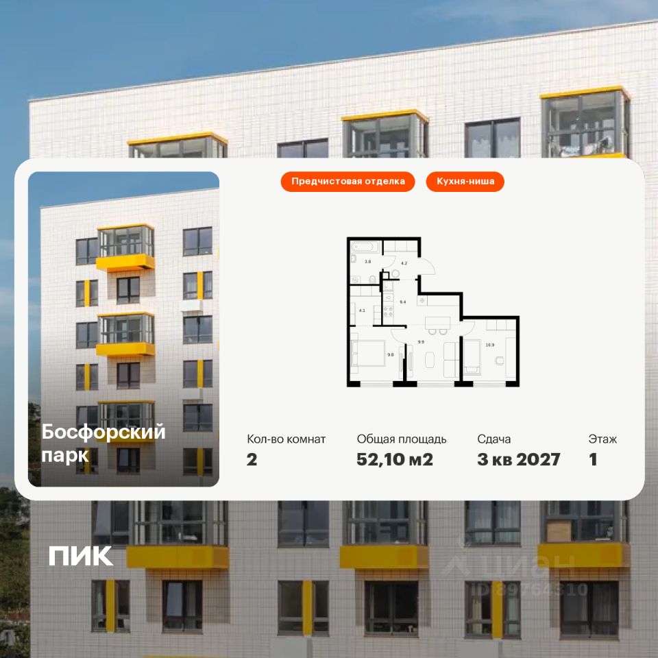 Продаётся 2-комн. квартира площадью 52,1 кв.м на 1 этаже 9 этажного дома (Корпус 10, Секция 1) проекта ПИК Босфорский парк. Светлый просторный подъезд на уровне земли, функциональная планировка, большие окна, предчистовая отделка.