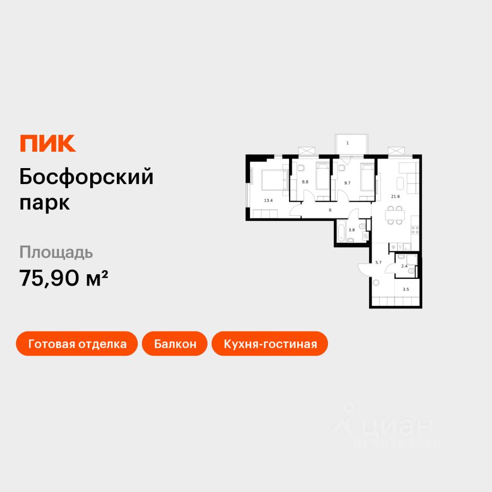 Продаётся 3-комн. квартира площадью 75,9 кв.м на 8 этаже 9 этажного дома (Корпус 9, Секция 1) проекта ПИК Босфорский парк. Светлый просторный подъезд на уровне земли, функциональная планировка, большие окна, c отделкой.