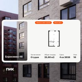 Продаётся квартира-студия площадью 25,8 кв.м на 10 этаже 28 этажного дома (Корпус 2, Секция 2) проекта ПИК Борисенко 48. Светлый просторный подъезд на уровне земли, функциональная планировка, большие окна, предчистовая отделка.