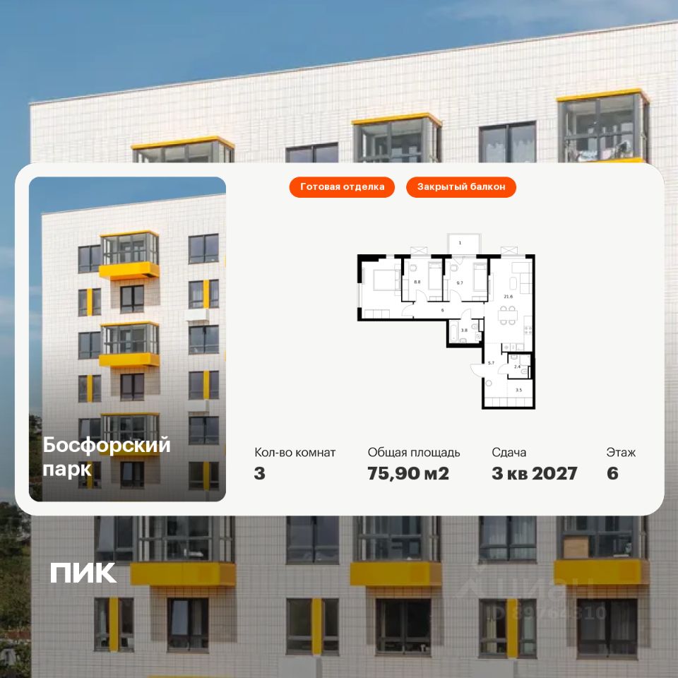 Продаётся 3-комн. квартира площадью 75,9 кв.м на 6 этаже 9 этажного дома (Корпус 9, Секция 1) проекта ПИК Босфорский парк. Светлый просторный подъезд на уровне земли, функциональная планировка, большие окна, c отделкой.