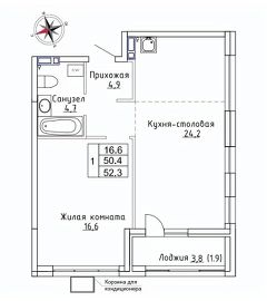 Продаётся 1-комнатная квартира в строящемся доме (Дом 1), срок сдачи: III-кв. 2026, общей площадью 52.3 кв.м., на 4 этаже. ЖК "Новый" - это: