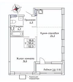 Продаётся 1-комнатная квартира в строящемся доме (Дом 1), срок сдачи: III-кв. 2026, общей площадью 52.3 кв.м., на 9 этаже. ЖК "Новый" - это: