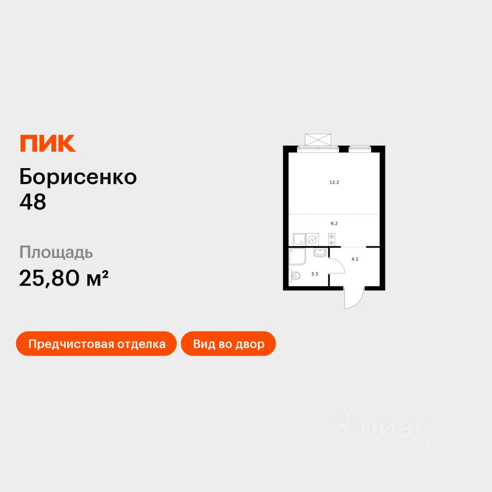 Продаётся квартира-студия площадью 25,8 кв.м на 3 этаже 28 этажного дома (Корпус 2, Секция 2) проекта ПИК Борисенко 48. Светлый просторный подъезд на уровне земли, функциональная планировка, большие окна, предчистовая отделка.