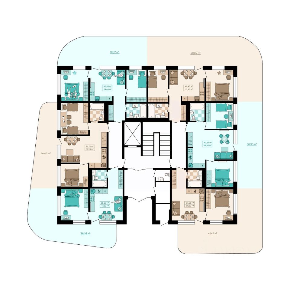 Отличительной особенностью проекта являются просторные индивидуальные террасы на первых этажах площадью до 65 кв. м, открывающие безграничные возможности для обустройства собственного сада, пространства для барбекю, персонального пляжа с шезлонгами или рабочей зоны на открытом воздухе.
