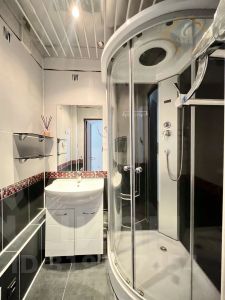 Полы — ламинат, стены и потолки выровнены, установлены новые сантехника и электропроводка. Санузел раздельный, облицован кафелем.