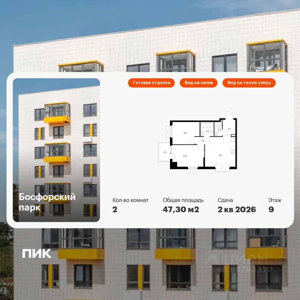 Продаётся 2-комн. квартира площадью 47,3 кв.м на 9 этаже 9 этажного дома (Корпус 4, Секция 1) проекта ПИК Босфорский парк. Светлый просторный подъезд на уровне земли, функциональная планировка, большие окна, c отделкой.