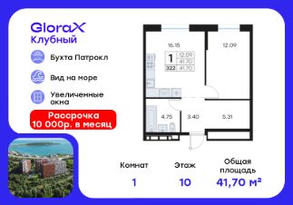 Продается 1-комн. квартира на 10-м этаже в квартале GloraX Клубный. GloraX Клубный - уникальный видовой проект с выделяющейся архитектурой в развитом районе Владивостока. Общая площадь лота составляет 41,70 кв. м, из которых 12,09 кв. м отведено под жилую и 16,15 кв. м под кухонную зону. Номер квартиры - 322.