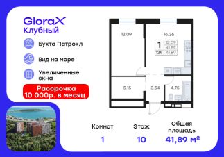 Продается 1-комн. квартира на 10-м этаже в квартале GloraX Клубный. GloraX Клубный - уникальный видовой проект с выделяющейся архитектурой в развитом районе Владивостока. Общая площадь лота составляет 41,89 кв. м, из которых 12,09 кв. м отведено под жилую и 16,36 кв. м под кухонную зону. Номер квартиры - 129.