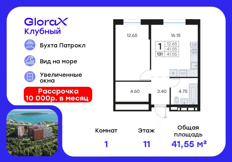 Продается 1-комн. квартира на 11-м этаже в квартале GloraX Клубный. GloraX Клубный - уникальный видовой проект с выделяющейся архитектурой в развитом районе Владивостока. Общая площадь лота составляет 41,55 кв. м, из которых 12,65 кв. м отведено под жилую и 16,15 кв. м под кухонную зону. Номер квартиры - 131.