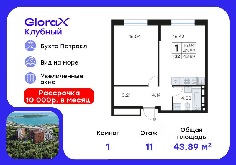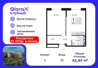 Продается 1-комн. квартира на 11-м этаже в квартале GloraX Клубный. GloraX Клубный - уникальный видовой проект с выделяющейся архитектурой в развитом районе Владивостока. Общая площадь лота составляет 43,89 кв. м, из которых 16,04 кв. м отведено под жилую и 16,42 кв. м под кухонную зону. Номер квартиры - 132.