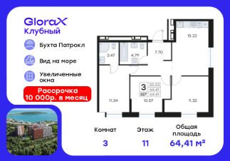 Продается 3-комн. квартира  на 11-м этаже в квартале GloraX Клубный. GloraX Клубный - уникальный видовой проект с выделяющейся архитектурой в развитом районе Владивостока. Общая площадь лота составляет 64,41 кв. м, из которых 33,23 кв. м отведено под жилую и 15,22 кв. м под кухонную зону. Номер квартиры - 327.