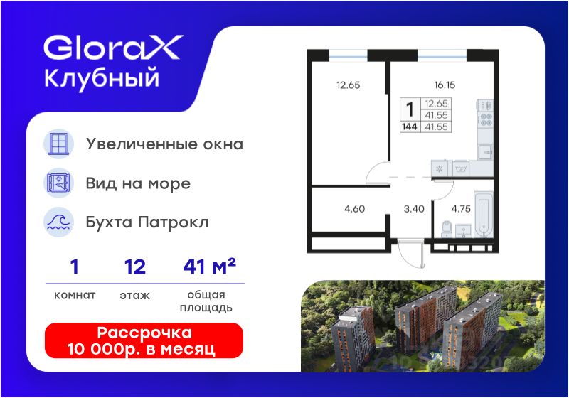Продается 1-комн. квартира на 12-м этаже в квартале GloraX Клубный. GloraX Клубный - уникальный видовой проект с выделяющейся архитектурой в развитом районе Владивостока. Общая площадь лота составляет 41,55 кв. м, из которых 12,65 кв. м отведено под жилую и 16,15 кв. м под кухонную зону. Номер квартиры - 144.