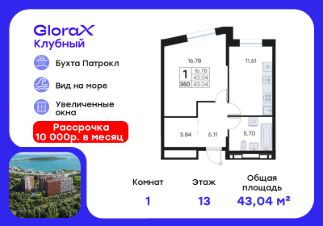 Продается 1-комн. квартира на 13-м этаже в квартале GloraX Клубный. GloraX Клубный - уникальный видовой проект с выделяющейся архитектурой в развитом районе Владивостока. Общая площадь лота составляет 43,04 кв. м, из которых 16,78 кв. м отведено под жилую и 11,61 кв. м под кухонную зону. Номер квартиры - 350.