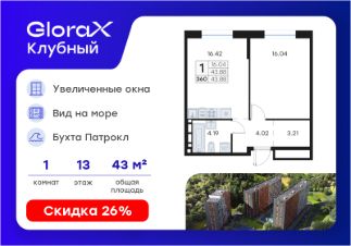 Продается 1-комн. квартира на 13-м этаже в квартале GloraX Клубный. GloraX Клубный - уникальный видовой проект с выделяющейся архитектурой в развитом районе Владивостока. Общая площадь лота составляет 43,88 кв. м, из которых 16,04 кв. м отведено под жилую и 16,42 кв. м под кухонную зону. Номер квартиры - 360.