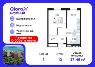 Продается 1-комн. квартира на 13-м этаже в квартале GloraX Клубный. GloraX Клубный - уникальный видовой проект с выделяющейся архитектурой в развитом районе Владивостока. Общая площадь лота составляет 37,45 кв. м, из которых 13,82 кв. м отведено под жилую и 10,92 кв. м под кухонную зону. Номер квартиры - 362.