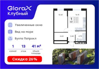 Продается 1-комн. квартира на 13-м этаже в квартале GloraX Клубный. GloraX Клубный - уникальный видовой проект с выделяющейся архитектурой в развитом районе Владивостока. Общая площадь лота составляет 41,55 кв. м, из которых 12,65 кв. м отведено под жилую и 16,15 кв. м под кухонную зону. Номер квартиры - 157. Преимущества квартиры: евро-двухкомнатная квартира; высокий этаж; гардеробная. Преимущества проекта: • Квартиры с панорамными видами на бухту Патрокл, маяк Басаргина и остров Русский • Планировочные решения под любой жизненный сценарий от 23 до 67 м² • Гардеробные комнаты, увеличенные панорамные окна, просторные кухни-гостиные • Эксклюзивное благоустройство: продуманное зонирование, игровые и спортивные площадки, площадка для стритбола, амфитеатр • Премиальный дизайн входных групп с лаунж-зоной • Безбарьерная среда, закрытая территория, видеонаблюдение • Лапомойки, колясочные и туалеты на первом этаже • Двухуровневый подземный паркинг на 350 машино-мест с лифтом на жилые этажи • Келлеры на цокольном этаже для хранения сезонных вещей с доступом на лифте • Современный ландшафтный дизайн комплекса от DEREVOPARK GloraX Клубный заповедник в черте мегаполиса. Комплекс тщательно продуман для максимального удобства и обеспечения безопасности его жителей. Квартал расположен в одном из самых современных развивающихся районов города: совсем рядом раскинулась живописная бухта Патрокл, где можно прогуляться по облагороженной пешеходной набережной, заглянуть на пляж или в школу серфинга. Комплекс имеет прекрасную транспортную доступность: рядом проходит объездная трасса СеданкаПатрокл, а до центар можно доехать всего за 15 минут. Проект включает 3 монолитных корпуса, каждый из которых спроектирован с акцентом на комфорт, безопасность и современный образ жизни рядом с уникальной природой. Общий двор создает приватную территорию для житей комплекса. В комплексе предусмотрен двухуровневый подземный паркинг на 350 машино-мест с доступом прямо с жилых этажей. Паркинг оборудован современными системами видеонаблюдения, контроля въезда-выезда и пожаротушения. На цокольном этаже размещаются келлеры для хранения сезонных и габаритных вещей. Доступ к кладовым на лифте с жилых этажей. Современный ландшафтный дизайн жилого комплекса GloraX Клубный создан ведущей российской студией DEREVOPARK. Во дворе для детей всех возрастов предусмотрены различные игровые площадки с лазалками, батутами, качелями и песочницей. В центре расположен специальный "зеленый остров", где взрослые могут отдохнуть на качелях и гамаках в тени больших деревьев. Для любителей спорта предусмотрены две специальные спортивные площадки для настольного тенниса и стритбола — для зрителей тоже найдется место! А еще на территории комплекса будет дорожка для роллеров и любителей покататься на велосипеде, самокате или скейте. В шаговой доступности располагаются все необходимые объекты социальной и коммерческой инфраструктуры. Ц