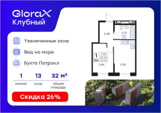 Продается 1-комн. квартира на 13-м этаже в квартале GloraX Клубный. GloraX Клубный - уникальный видовой проект с выделяющейся архитектурой в развитом районе Владивостока. Общая площадь лота составляет 32,36 кв. м, из которых 9,84 кв. м отведено под жилую и 11,95 кв. м под кухонную зону. Номер квартиры - 356.