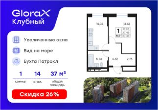 Продается 1-комн. квартира на 14-м этаже в квартале GloraX Клубный. GloraX Клубный - уникальный видовой проект с выделяющейся архитектурой в развитом районе Владивостока. Общая площадь лота составляет 37,45 кв. м, из которых 13,82 кв. м отведено под жилую и 10,92 кв. м под кухонную зону. Номер квартиры - 169.