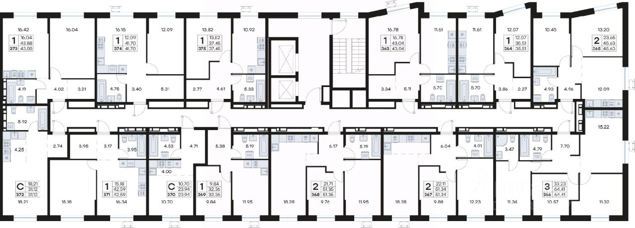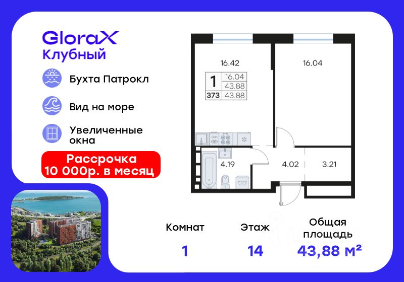 Продается 1-комн. квартира на 14-м этаже в квартале GloraX Клубный. GloraX Клубный - уникальный видовой проект с выделяющейся архитектурой в развитом районе Владивостока. Общая площадь лота составляет 43,88 кв. м, из которых 16,04 кв. м отведено под жилую и 16,42 кв. м под кухонную зону. Номер квартиры - 373.