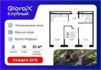 Продается 2-комн. квартира на 14-м этаже в квартале GloraX Клубный. GloraX Клубный - уникальный видовой проект с выделяющейся архитектурой в развитом районе Владивостока. Общая площадь лота составляет 51,34 кв. м, из которых 22,11 кв. м отведено под жилую и 18,28 кв. м под кухонную зону. Номер квартиры - 367.