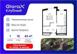 Продается 1-комн. квартира на 15-м этаже в квартале GloraX Клубный. GloraX Клубный - уникальный видовой проект с выделяющейся архитектурой в развитом районе Владивостока. Общая площадь лота составляет 43,04 кв. м, из которых 16,78 кв. м отведено под жилую и 11,61 кв. м под кухонную зону. Номер квартиры - 376.