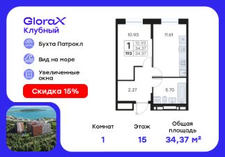 Продается 1-комн. квартира на 15-м этаже в квартале GloraX Клубный. GloraX Клубный - уникальный видовой проект с выделяющейся архитектурой в развитом районе Владивостока. Общая площадь лота составляет 34,37 кв. м, из которых 10,93 кв. м отведено под жилую и 11,61 кв. м под кухонную зону. Номер квартиры - 193.
