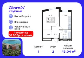 Продается 1-комн. квартира на 2-м этаже в квартале GloraX Клубный. GloraX Клубный - уникальный видовой проект с выделяющейся архитектурой в развитом районе Владивостока. Общая площадь лота составляет 43,04 кв. м, из которых 16,78 кв. м отведено под жилую и 11,61 кв. м под кухонную зону. Номер квартиры - 207.