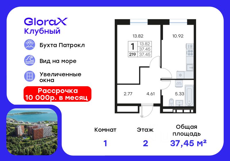 Продается 1-комн. квартира на 2-м этаже в квартале GloraX Клубный. GloraX Клубный - уникальный видовой проект с выделяющейся архитектурой в развитом районе Владивостока. Общая площадь лота составляет 37,45 кв. м, из которых 13,82 кв. м отведено под жилую и 10,92 кв. м под кухонную зону. Номер квартиры - 219.