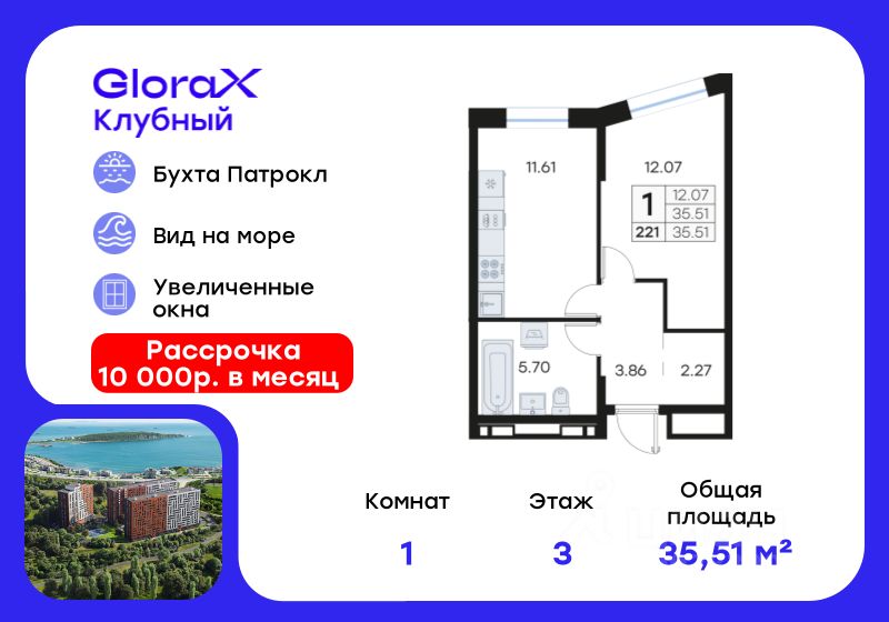 Продается 1-комн. квартира на 3-м этаже в квартале GloraX Клубный. GloraX Клубный - уникальный видовой проект с выделяющейся архитектурой в развитом районе Владивостока. Общая площадь лота составляет 35,51 кв. м, из которых 12,07 кв. м отведено под жилую и 11,61 кв. м под кухонную зону. Номер квартиры - 221.
