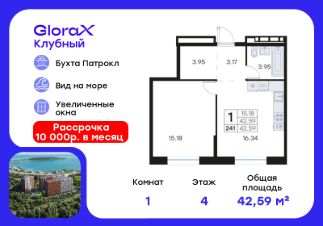 Продается 1-комн. квартира на 4-м этаже в квартале GloraX Клубный. GloraX Клубный - уникальный видовой проект с выделяющейся архитектурой в развитом районе Владивостока. Общая площадь лота составляет 42,59 кв. м, из которых 15,18 кв. м отведено под жилую и 16,34 кв. м под кухонную зону. Номер квартиры - 241.