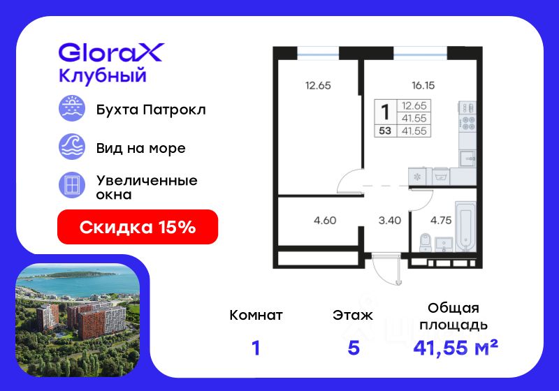 Продается 1-комн. квартира на 5-м этаже в квартале GloraX Клубный. GloraX Клубный - уникальный видовой проект с выделяющейся архитектурой в развитом районе Владивостока. Общая площадь лота составляет 41,55 кв. м, из которых 12,65 кв. м отведено под жилую и 16,15 кв. м под кухонную зону. Номер квартиры - 53.