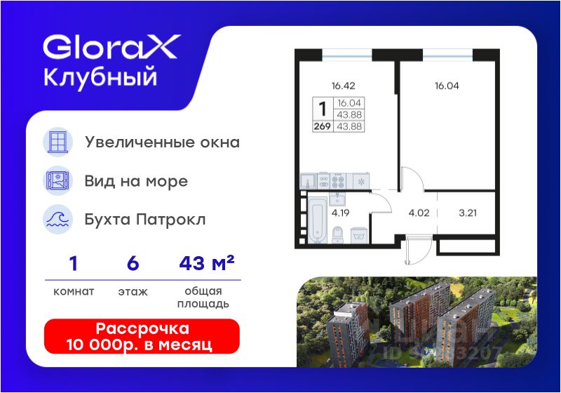 Продается 1-комн. квартира на 6-м этаже в квартале GloraX Клубный. GloraX Клубный - уникальный видовой проект с выделяющейся архитектурой в развитом районе Владивостока. Общая площадь лота составляет 43,88 кв. м, из которых 16,04 кв. м отведено под жилую и 16,42 кв. м под кухонную зону. Номер квартиры - 269.