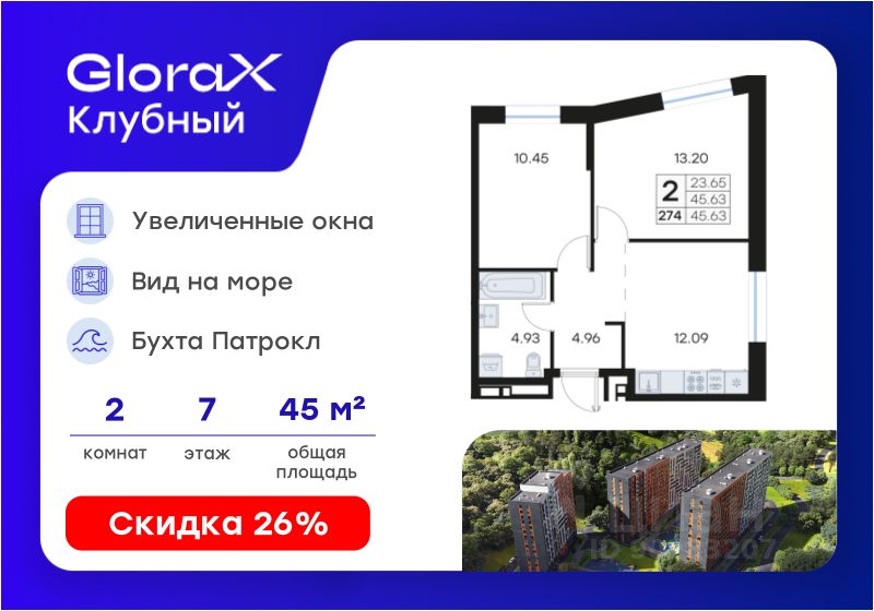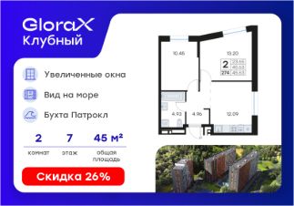 Продается 2-комн. квартира на 7-м этаже в квартале GloraX Клубный. GloraX Клубный - уникальный видовой проект с выделяющейся архитектурой в развитом районе Владивостока. Общая площадь лота составляет 45,63 кв. м, из которых 23,65 кв. м отведено под жилую и 12,09 кв. м под кухонную зону. Номер квартиры - 274.