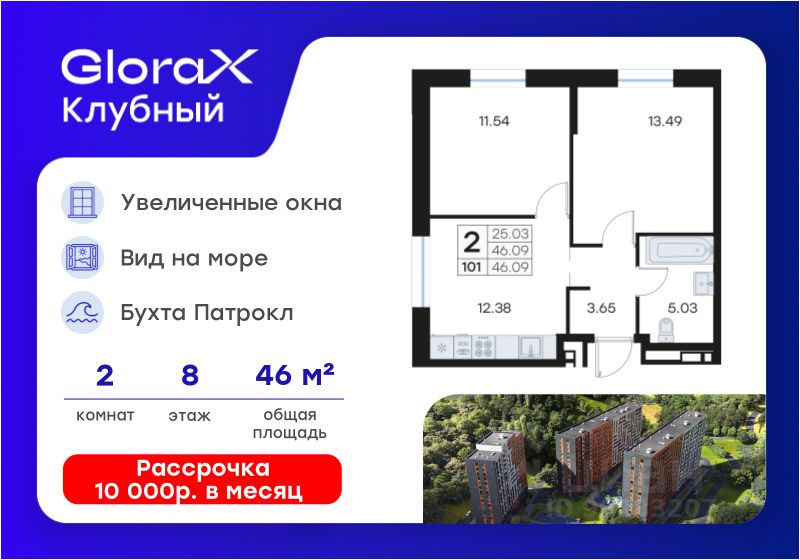 Продается 2-комн. квартира на 8-м этаже в квартале GloraX Клубный. GloraX Клубный - уникальный видовой проект с выделяющейся архитектурой в развитом районе Владивостока. Общая площадь лота составляет 46,09 кв. м, из которых 25,03 кв. м отведено под жилую и 12,38 кв. м под кухонную зону. Номер квартиры - 101. Преимущества квартиры: двухкомнатная квартира; угловая. Преимущества проекта: • Квартиры с панорамными видами на бухту Патрокл, маяк Басаргина и остров Русский • Планировочные решения под любой жизненный сценарий от 23 до 67 м² • Гардеробные комнаты, увеличенные панорамные окна, просторные кухни-гостиные • Эксклюзивное благоустройство: продуманное зонирование, игровые и спортивные площадки, площадка для стритбола, амфитеатр • Премиальный дизайн входных групп с лаунж-зоной • Безбарьерная среда, закрытая территория, видеонаблюдение • Лапомойки, колясочные и туалеты на первом этаже • Двухуровневый подземный паркинг на 350 машино-мест с лифтом на жилые этажи • Келлеры на цокольном этаже для хранения сезонных вещей с доступом на лифте • Современный ландшафтный дизайн комплекса от DEREVOPARK GloraX Клубный заповедник в черте мегаполиса. Комплекс тщательно продуман для максимального удобства и обеспечения безопасности его жителей. Квартал расположен в одном из самых современных развивающихся районов города: совсем рядом раскинулась живописная бухта Патрокл, где можно прогуляться по облагороженной пешеходной набережной, заглянуть на пляж или в школу серфинга. Комплекс имеет прекрасную транспортную доступность: рядом проходит объездная трасса СеданкаПатрокл, а до центар можно доехать всего за 15 минут. Проект включает 3 монолитных корпуса, каждый из которых спроектирован с акцентом на комфорт, безопасность и современный образ жизни рядом с уникальной природой. Общий двор создает приватную территорию для житей комплекса. В комплексе предусмотрен двухуровневый подземный паркинг на 350 машино-мест с доступом прямо с жилых этажей. Паркинг оборудован современными системами видеонаблюдения, контроля въезда-выезда и пожаротушения. На цокольном этаже размещаются келлеры для хранения сезонных и габаритных вещей. Доступ к кладовым на лифте с жилых этажей. Современный ландшафтный дизайн жилого комплекса GloraX Клубный создан ведущей российской студией DEREVOPARK. Во дворе для детей всех возрастов предусмотрены различные игровые площадки с лазалками, батутами, качелями и песочницей. В центре расположен специальный "зеленый остров", где взрослые могут отдохнуть на качелях и гамаках в тени больших деревьев. Для любителей спорта предусмотрены две специальные спортивные площадки для настольного тенниса и стритбола — для зрителей тоже найдется место! А еще на территории комплекса будет дорожка для роллеров и любителей покататься на велосипеде, самокате или скейте. В шаговой доступности располагаются все необходимые объекты социальной и коммерческой инфраструктуры. Цена указана при 100% опл