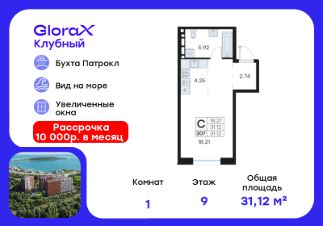 Продается квартира-студия на 9-м этаже в квартале GloraX Клубный. GloraX Клубный - уникальный видовой проект с выделяющейся архитектурой в развитом районе Владивостока. Общая площадь лота составляет 31,12 кв. м, из которых 18,21 кв. м отведено под жилую и 4,25 кв. м под кухонную зону. Номер квартиры - 307.