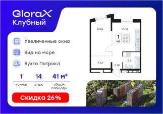Продается 1-комн. квартира на 14-м этаже в квартале GloraX Клубный. GloraX Клубный - уникальный видовой проект с выделяющейся архитектурой в развитом районе Владивостока. Общая площадь лота составляет 41,47 кв. м, из которых 13,52 кв. м отведено под жилую и 14,92 кв. м под кухонную зону. Номер квартиры - 145.