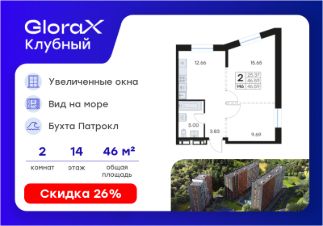 Продается 2-комн. квартира на 14-м этаже в квартале GloraX Клубный. GloraX Клубный - уникальный видовой проект с выделяющейся архитектурой в развитом районе Владивостока. Общая площадь лота составляет 46,59 кв. м, из которых 25,37 кв. м отведено под жилую и 12,66 кв. м под кухонную зону. Номер квартиры - 146.