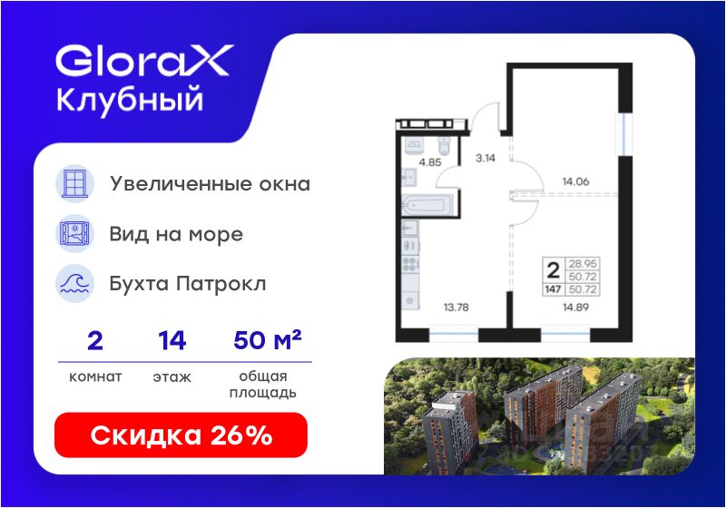 Продается 2-комн. квартира на 14-м этаже в квартале GloraX Клубный. GloraX Клубный - уникальный видовой проект с выделяющейся архитектурой в развитом районе Владивостока. Общая площадь лота составляет 50,72 кв. м, из которых 28,95 кв. м отведено под жилую и 13,78 кв. м под кухонную зону. Номер квартиры - 147.
