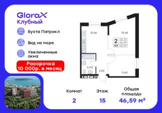 Продается 2-комн. квартира на 15-м этаже в квартале GloraX Клубный. GloraX Клубный - уникальный видовой проект с выделяющейся архитектурой в развитом районе Владивостока. Общая площадь лота составляет 46,59 кв. м, из которых 25,37 кв. м отведено под жилую и 12,66 кв. м под кухонную зону. Номер квартиры - 159.