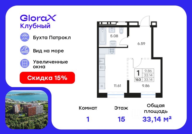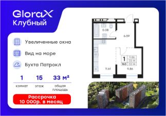 Продается 1-комн. квартира на 15-м этаже в квартале GloraX Клубный. GloraX Клубный - уникальный видовой проект с выделяющейся архитектурой в развитом районе Владивостока. Общая площадь лота составляет 33,14 кв. м, из которых 9,86 кв. м отведено под жилую и 11,61 кв. м под кухонную зону. Номер квартиры - 163.