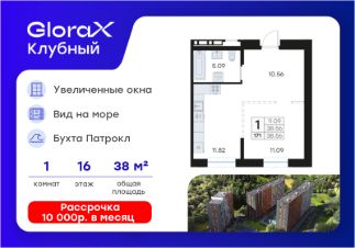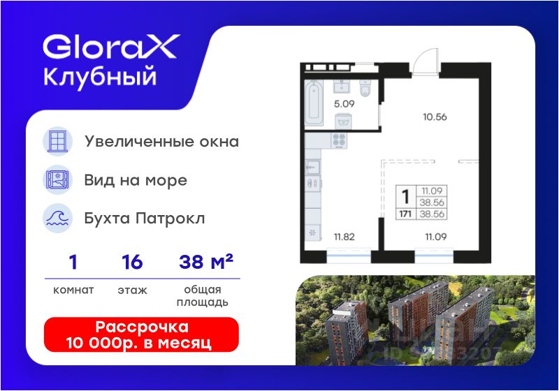 Продается 1-комн. квартира на 16-м этаже в квартале GloraX Клубный. GloraX Клубный - уникальный видовой проект с выделяющейся архитектурой в развитом районе Владивостока. Общая площадь лота составляет 38,56 кв. м, из которых 11,09 кв. м отведено под жилую и 11,82 кв. м под кухонную зону. Номер квартиры - 171.