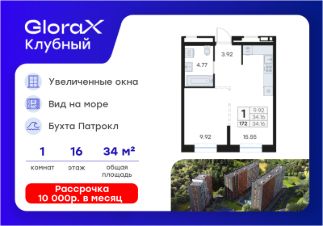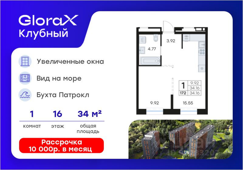 Продается 1-комн. квартира на 16-м этаже в квартале GloraX Клубный. GloraX Клубный - уникальный видовой проект с выделяющейся архитектурой в развитом районе Владивостока. Общая площадь лота составляет 34,16 кв. м, из которых 9,92 кв. м отведено под жилую и 15,55 кв. м под кухонную зону. Номер квартиры - 172.